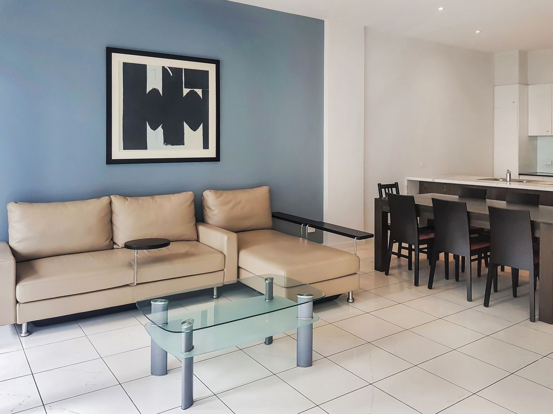 - Leather couch, dining table