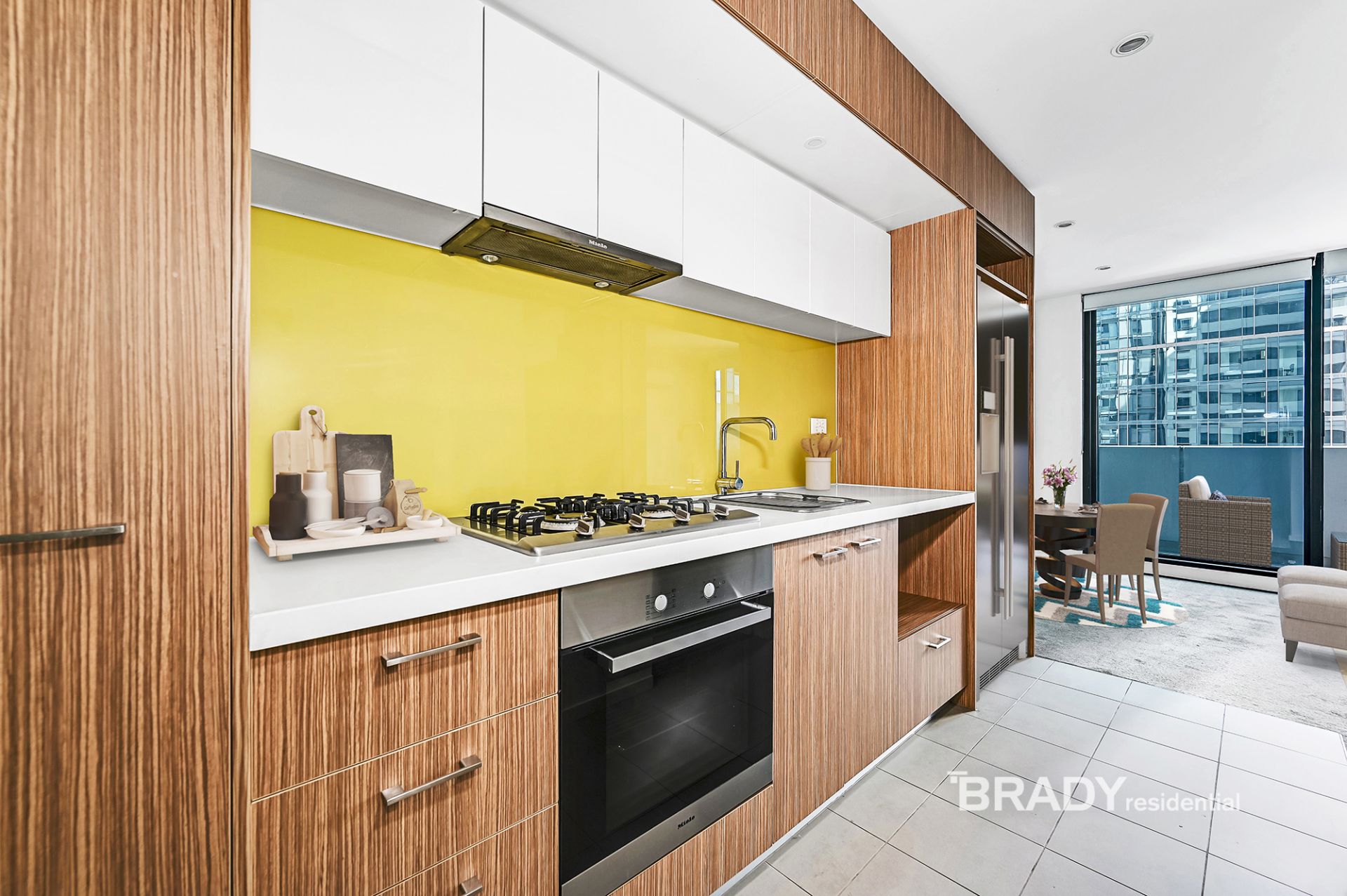Step inside to a spacious, light-filled open-plan living and dining zone framed by floor-to-ceiling glass. The contemporary stone-topped kitchen is equipped with premium Miele appliances, a 4-burner gas cooktop, soft-close cabinetry, and a pull-out pantry-perfectly blending function and flair.