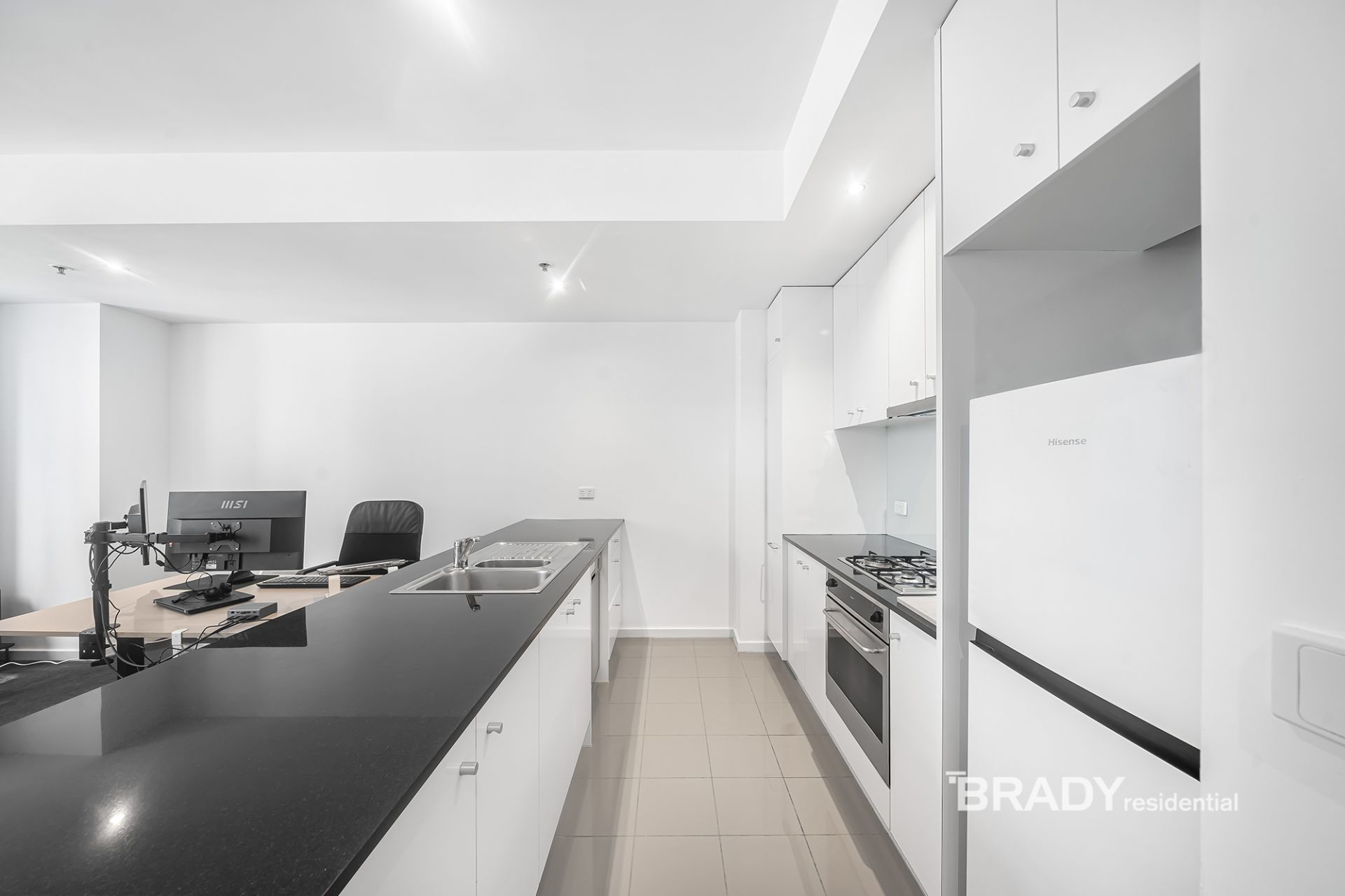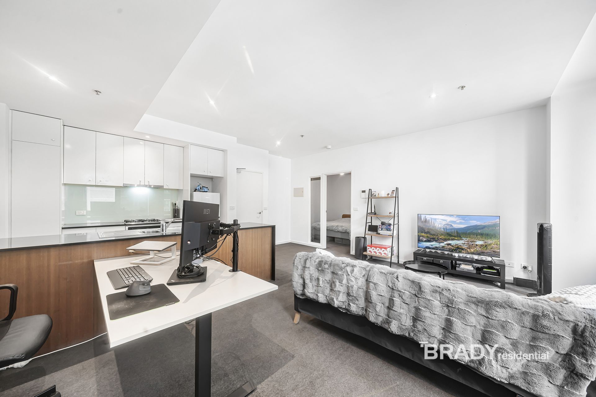 The heart of the apartment is a spacious open-plan living and dining area, anchored by a striking over two-metre island bench that offers both functionality and style. The streamlined, galley-style kitchen is finished with stainless steel appliances including an oven, cooktop, rangehood and integrated dishwasher, ideal for both home cooking and entertaining.