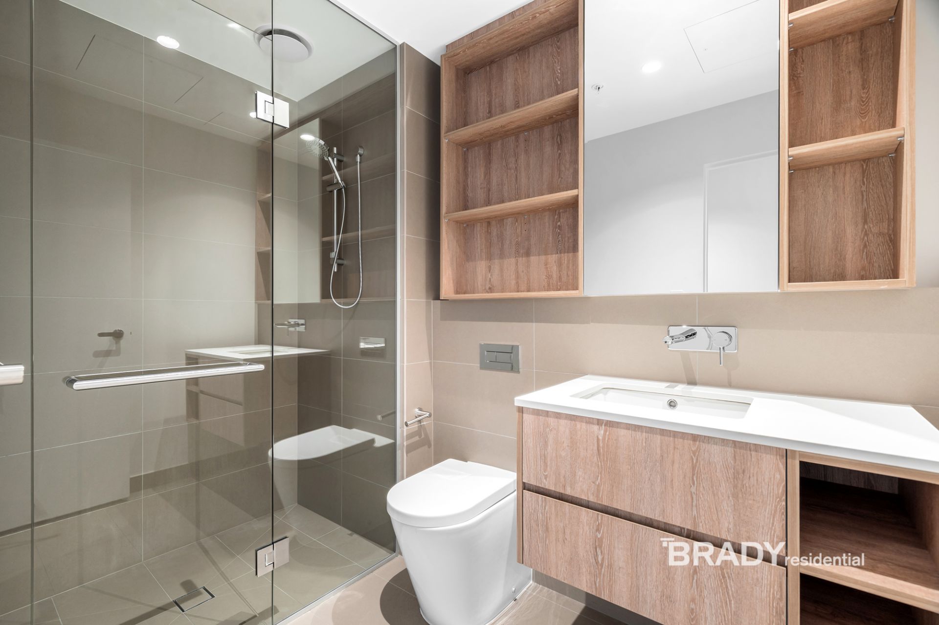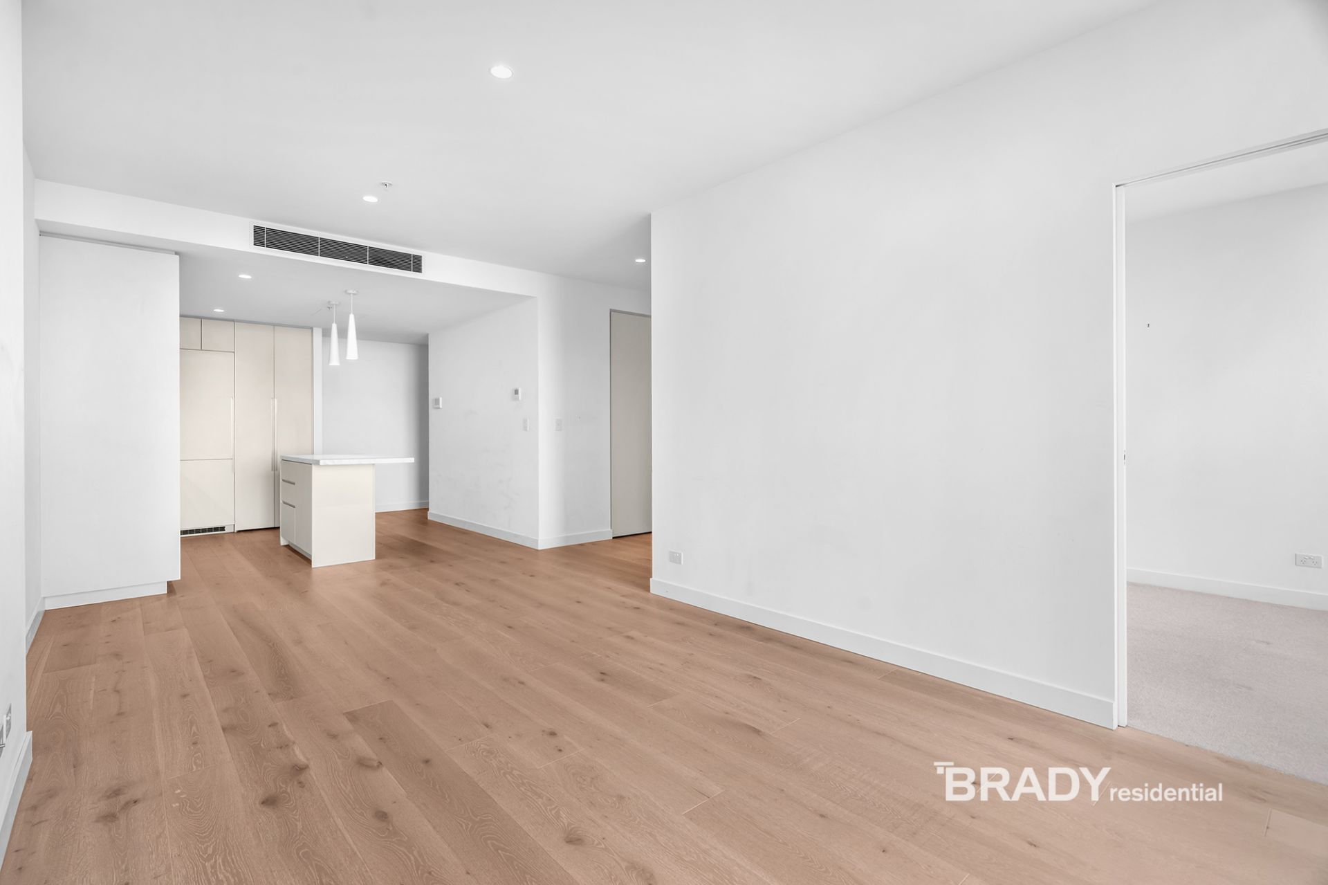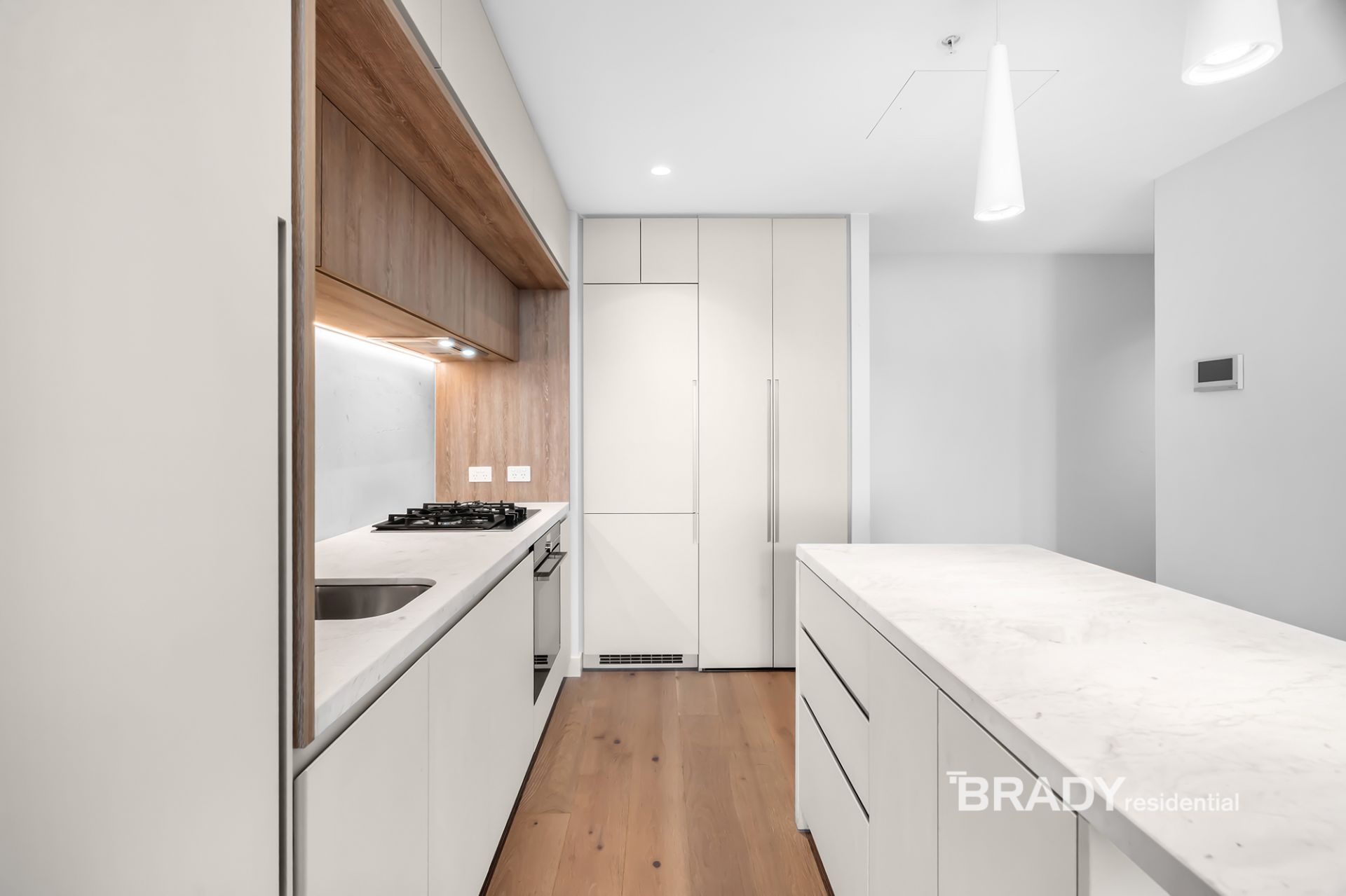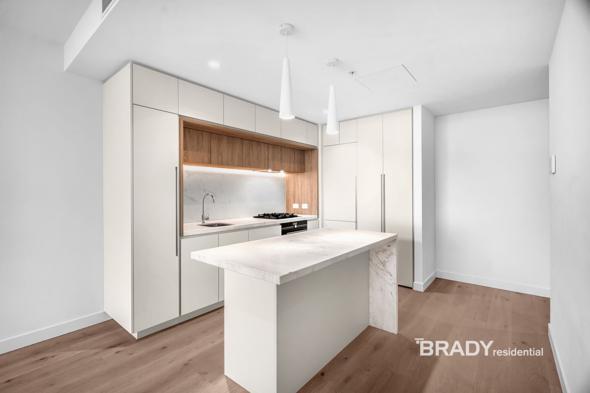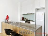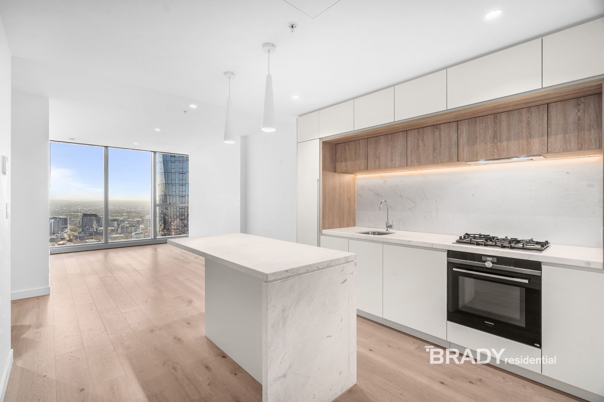 Framed by floor-to-ceiling glass, the open-plan living and dining area is bathed in natural light and enhanced by lightly toned timber flooring and calming neutral finishes. A sleek stone-detailed kitchen offers functionality and sophistication in equal measure, featuring an island bench, soft-close cabinetry, and premium Siemens appliances including a built-in fridge, gas cooktop, and dishwasher.