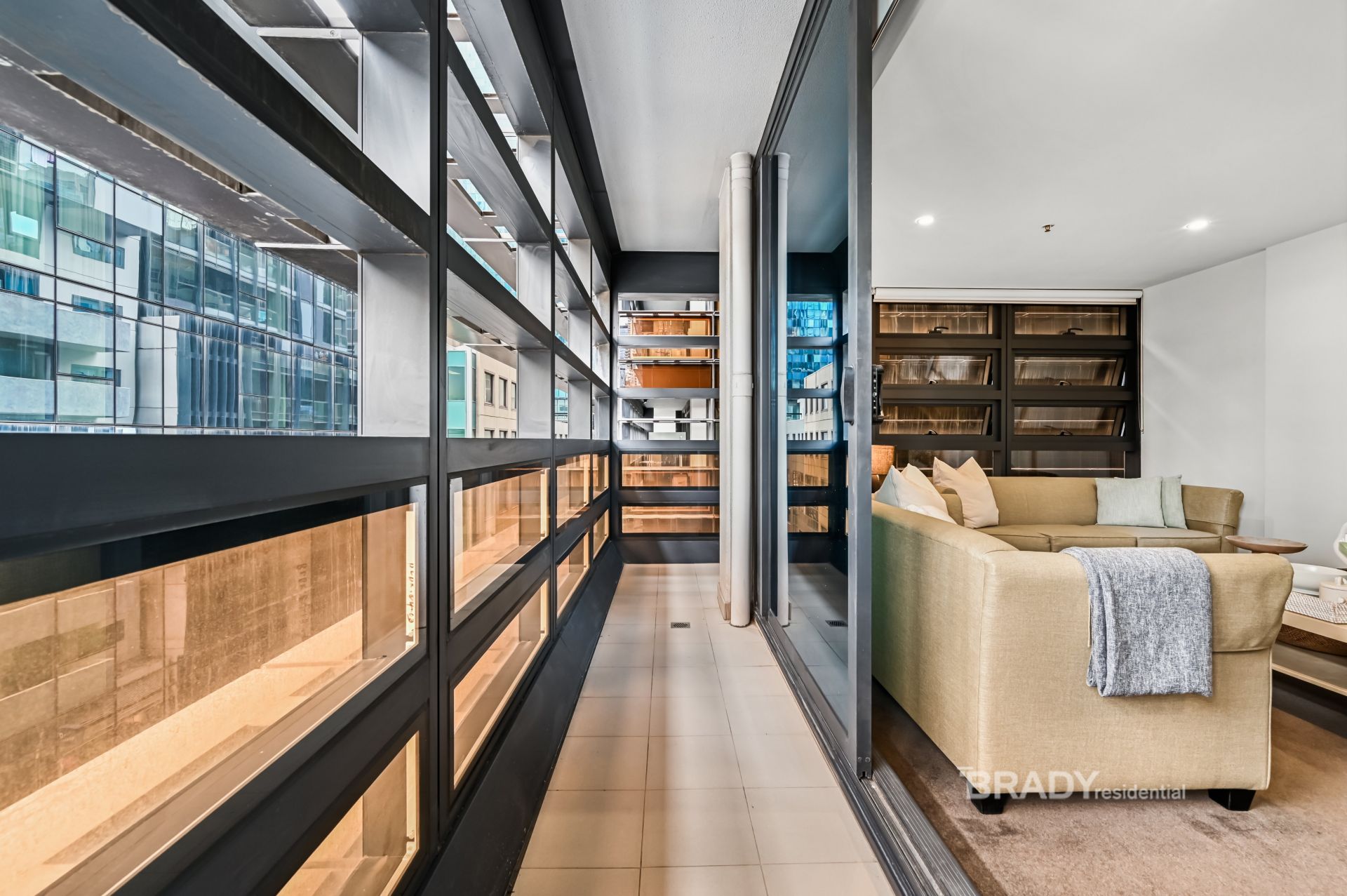 The open-plan living and dining area is complemented by a sleek kitchen appointed with stone benchtops, high-quality Miele appliances, a four-burner gas cooktop, Fisher & Paykel Dishwasher and a practical pull-out pantry. Extending from the living space, a fully enclosed winter garden facing Little Lonsdale Street offers a versatile all-weather zone ideal for relaxing, working or dining while enjoying the vibrant city surrounds.