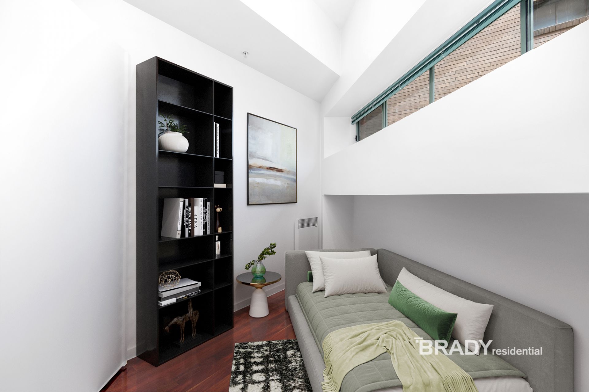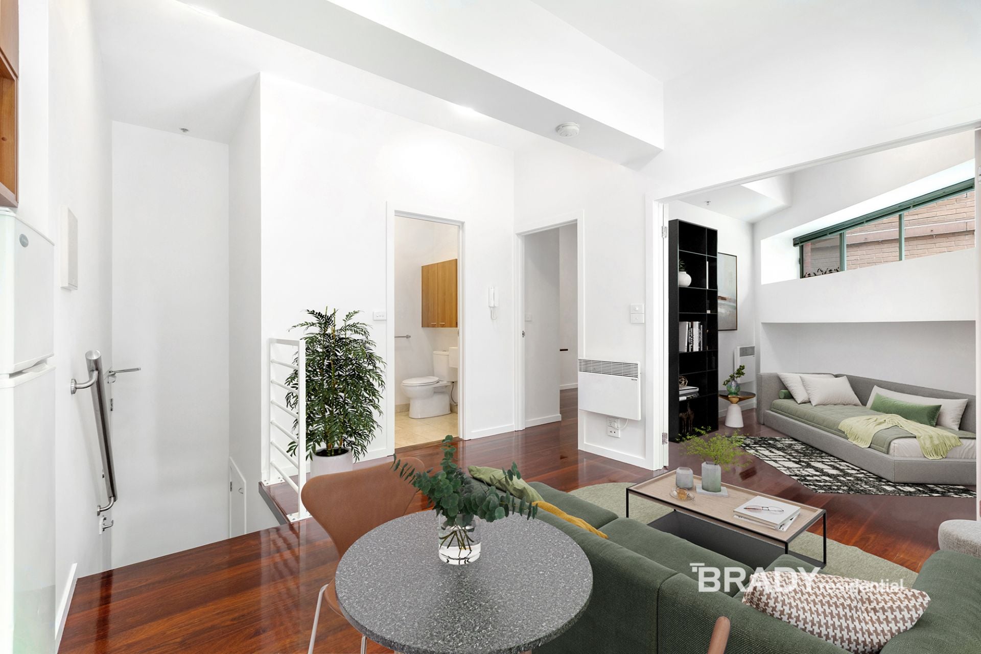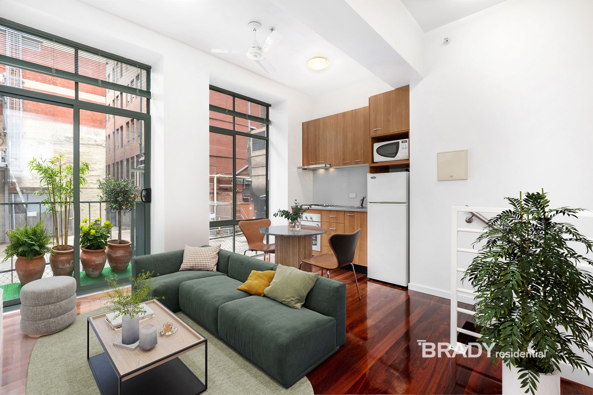 Stepping inside, you are immediately welcomed by an open-plan living space enhanced by solid Australian jarrah wood floors and soaring ceilings that evoke classic "Old New York" loft living. Large windows on two sides flood the apartment with natural light, creating a bright and inviting atmosphere rarely found in ground-floor residences. A ceiling fan has been thoughtfully installed to complement the space, ensuring year-round comfort while maintaining the apartment's relaxed, airy feel.
